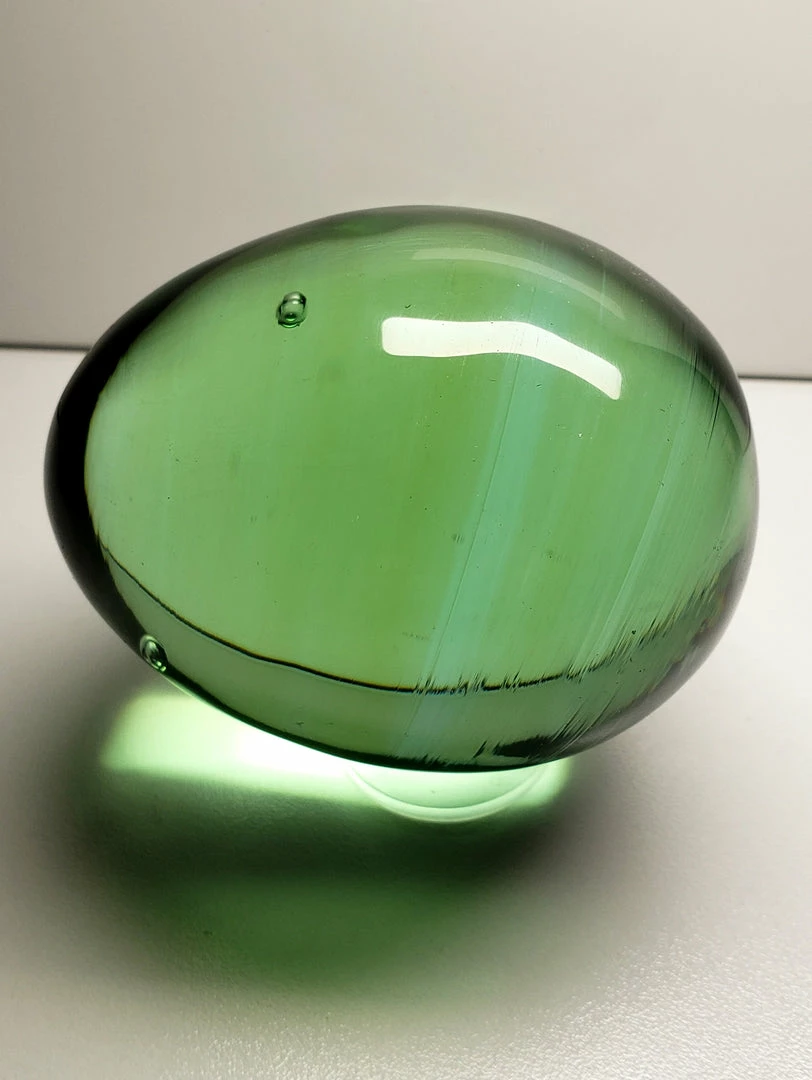 This Polished Andara Crystal in an egg shape is a Bi-color of Light Green & Brown. It has two sweet bubbles towards the upper part. The shaman influence in this one is extremely subtle making it appear a wonderful shade of green from most views. Yet if you turn it a certain way you can see the light stripes of the shaman brown.