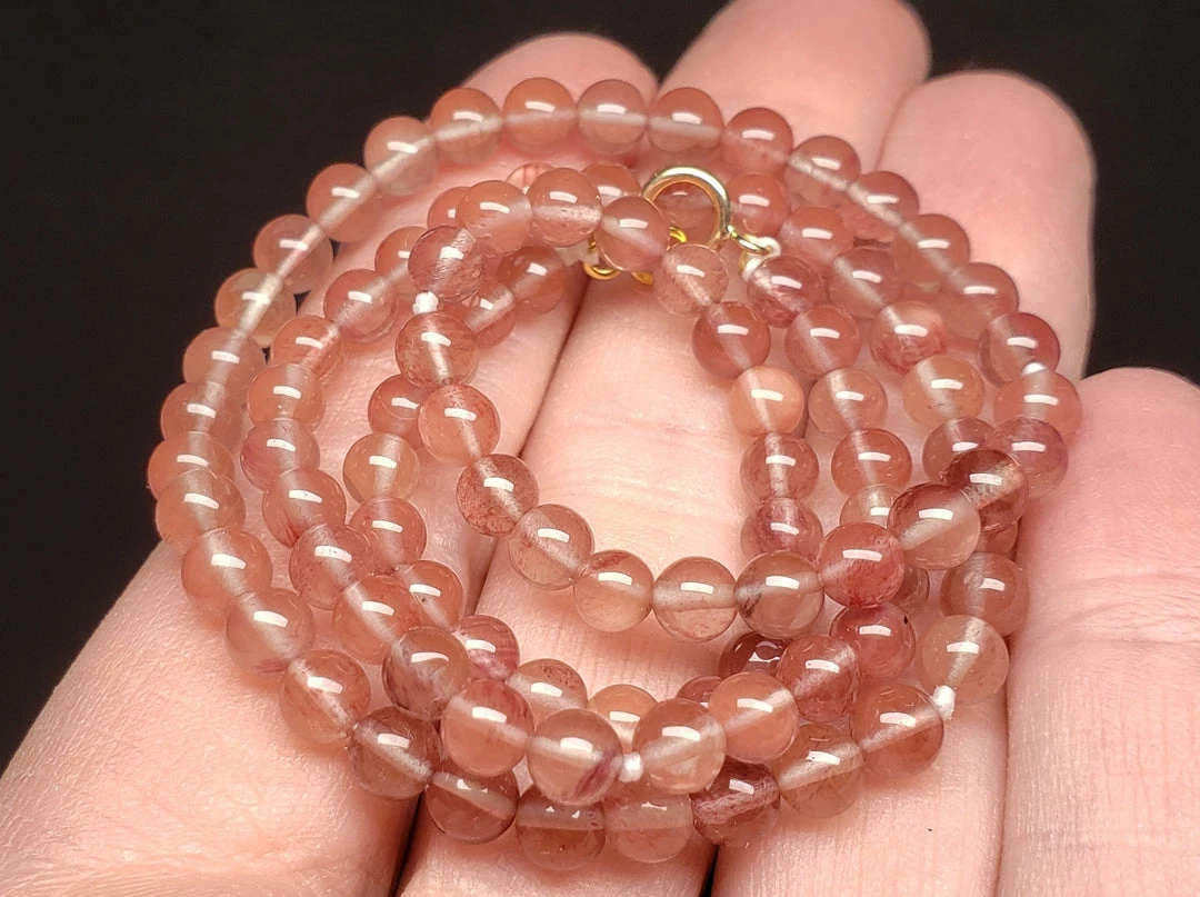 This necklace shows deeper hues of reds, some greens and a stronger champange.