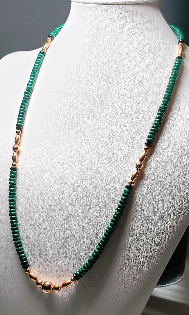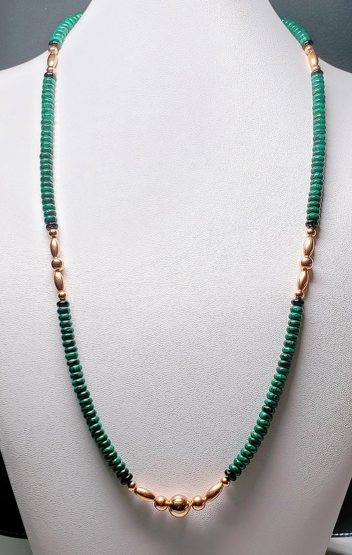* A note about Malachite roundel beads – the stripes needed for the best vibrational input from Malachite are present in every bead but not seen from the outside. They are in alignment to the drill hole and are visible when bead is laid flat – unstrung. This tends to produce an even stronger force for seeking out dis-harmonies within the body system.