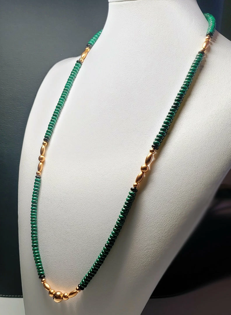 * A note about Malachite roundel beads – the stripes needed for the best vibrational input from Malachite are present in every bead but not seen from the outside. They are in alignment to the drill hole and are visible when bead is laid flat – unstrung. This tends to produce an even stronger force for seeking out dis-harmonies within the body system.