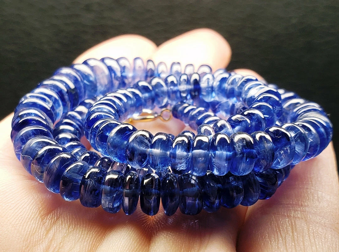 ย Kyanite consists of multiple layers of very thin, flat crystal blades that resemble the pages of a book or the blades of a fan.ย It is difficult to find therapeutic qualities as it tends to be more opaque and due to its natural shape it can be challenging to make beads. So in general all Kyanite is rare.