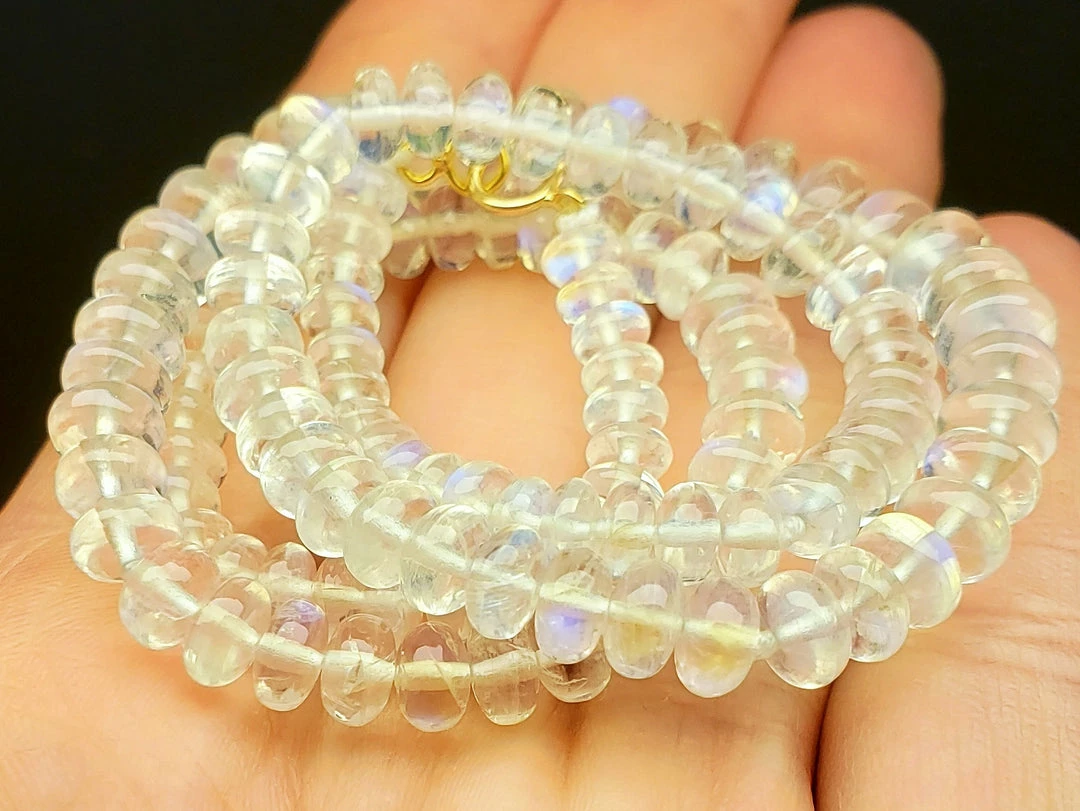 In describing Rainbow Blue Moonstone I would like to choose the word mystical. If one examines this gem closely, one will find that it is pure clear/white with flashes of blue and sometimes yellow. The way it looks gives great insight to its workings which include high purity, clarity, and activation. Rainbow Blue Moonstone connects to the higher realms easily integrating the higher frequencies within the body/system. It instantly creates balance with the intake (of the higher frequencies) making the integration as simple as eating.