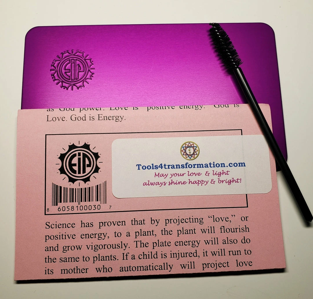 “The plates have been anodized with the color Violet, which is the healing ray of the rainbow spectrum. Their atomic structure has been altered, so that they are in resonance with a high-frequency vibration of the life energy force, in a complex way, connected with the known energy of negative ions. The “purple energy plates” (my own personal name for them) possess a field of energy capable of penetrating any living thing – plant, animal or human. The life force energy, or Prana, can be measured in several ways. One of them is through radionic equipment. Using this measurement, the energy level of an individual man or woman not yet fully illuminated might register, say, 20 on the scale. When this person is handed a purple plate the reading will instantly increase to 90 or 95. It won’t remain at that level, but continual use of the plate will gradually bring the person’s energy to 100 permanently. Enlightenment. And higher than 100, since the life force energy cannot be completely measured by any device presently known.